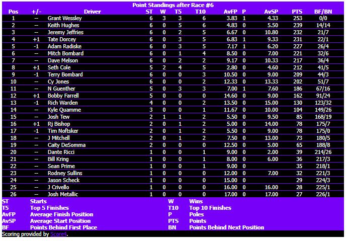 | 1 | Grant Wessley | 658 | 0 | 6 | 21 | 21 |